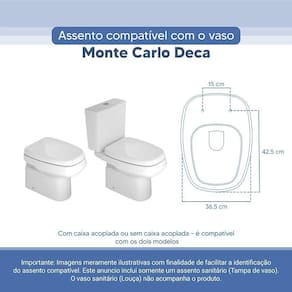 Tampa Vaso Sanitário Poliester Acrilico Monte Carlo Branco Para Bacia Deca A Tampa Vaso Sanitário Poliester Acrilico Monte Carlo Branco para bacia Deca é o que faltava para deixar seu banheiro ainda mais bonito. EXELENTE DURABILIDADE * É totalmente impermeável * Pode ser lavado com água à vontade
