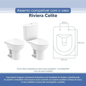 Tampa Vaso Sanitário Poliester Acrilico Riviera Branco Para Bacia Celite A Tampa Vaso Sanitário Poliester Acrilico Riviera Branco para bacia Celite é o que faltava para deixar seu banheiro ainda mais bonito. EXELENTE DURABILIDADE * É totalmente impermeável * Pode ser lavado com água à vontade