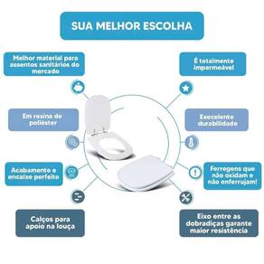 DIFERENCIAL * Possui calços que evitam o contato direto com a louça e que o assento deslize lateralmente. * Proporcionam maior estabilidade durante o uso. * Acabamento e encaixe perfeito no vaso sanitário. * Possui eixo entre as dobradiças, mantendo o assento sanitário firme na louça. * Sua ferragem metálica é super resistente e não oxida e nem enferruja.