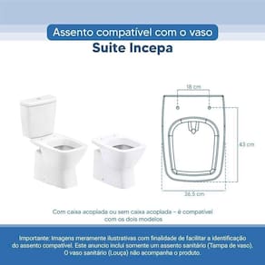 OBS.: O código 6LPF gravado na louça sanitária corresponde ao fluxo de água de uma descarga e não indica o modelo da mesma. RBN: Casa/Banho/Instalações e Acessórios de Banheiro/Vasos Sanitários e Peças/Assento de Vaso Sanitário | Conteúdo da Embalagem: 01 Assento Sanitário | Tipo: Assento Sanitário | Produto: Assento Sanitário | Site do Fabricante: www.ponttolavabo.com.br/ | Marca do Assento Sanitário: Pontto Lavabo | Garantia: 6 meses contra defeitos de fabricação | Dica: Instalação: sem desmontar o produto, posicione sobre o vaso sanitário e encaixe os dois parafusos com as borrachas pretas dentro do furo do vaso. Aperte com a chave de fenda no sentido horário até ficar firme. | Para Vaso Sanitário do Modelo: Suite | Para vaso Sanitário da Marca: Incepa | Cor: Branco | Tonalidade: Branco | Material do Assento Sanitário: Poliéster | Instruções de Limpeza: Recomenda-se a limpeza com água e sabão neutro, não utilizar produtos abrasivos ou químicos | Almofadado?: Não | Peso do Produto: 2.98 | Tipo de Fechamento: Fechamento Comum | Material da Fixação: Alumínio Anodizado | Precisa de baterias ou pilhas: Não | Regulamentações aplicáveis a produtos perigosos: Não se aplica | Código de certificação: Não se aplica Ean: 7899983692554