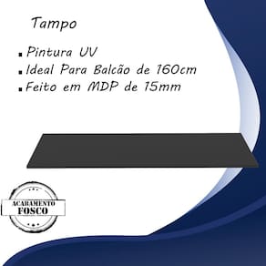 Tampo Para Balcao 160cm 9320, com estrutura em MDP de 15mm, acabamento em pintura UV. Indicado para balcão de 160 cm. Mais produtos para a composição da sua cozinha você encontra em nosso site, podendo montar o ambiente completo para sua cozinha, produzido com alto controle de qualidade e com excelente acabamento. Este móvel chegará em sua casa separado em 01 volume.