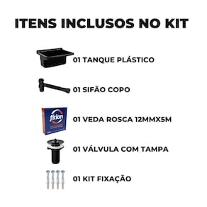 Tanque de plástico 22l para lavanderia preto + sifão copo universal sanfonado + fita veda rosca Tanque plástico 22l para lavanderia preto astra O uso do tanque de lavar roupa é ideal para lavagem de roupas delicadas, como roupas íntimas, de bebês e peças que requerem atenção especial, pois permite um controle mais preciso da temperatura e movimento das roupas durante a lavagem. Também é uma opção prática para pré-lavagem de roupas muito sujas antes de colocá-las em uma máquina de lavar. O tanque de lavar roupa é uma opção acessível e prática para quem deseja lavar roupas à mão sem abrir do conforto e da praticidade de um equipamento projeto para essa finalidade. Especificações técnicas Material: polipropilen Dimensões: 47,2 x 42,8 x 26,7cm Capacidade: volume útil/total 13 / 22 litros Locais sugeridos: lavanderias Acompanha torneira: não Acabamento: brilhante Marca: astra Cor: preto Sifão sanfonado universal com copo 49cm perto astra O sifão sanfonado universal com copo astra é um acessório essencial de encanamento, projetado para se adaptar a qualquer saída de válvula de pia e a qualquer tubulação de esgoto, independentemente de seu tamanho ou tipo. Além disso, o sifão sanfonado universal astra corrige possíveis desalinhamentos entre a cuba e a tubulação de despejo, evitando assim a formação de bloqueios e obstruções que possam causar vazamentos ou refluxo de água suja. Esse acessório é ideal para tanques, pias e cubas em banheiros, cozinhas e lavanderias. O copo, por sua vez, funciona como uma barreira para impedir que resíduos sólidos ou cabelos obstruem o fluxo de água. E também pode ser removido para facilitar sua limpeza, apenas rosqueado no seu sentido horário. Ele também é resistente a altas temperaturas, suportando água fria e quente até 90c, o que o torna adequado para ser Utilizado em qualquer tipo de ambiente. Este sifão é compatível com tubos e conexões de 38, 40, 48 e 50mm, garantindo uma instalação fácil e segura, sem necessidade de ferramentas especiais. Ele é feito de plástico abs de alta qualidade, o que o torna resistente a rachaduras, corrosão e vazamentos, garantindo sua durabilidade ao longo do tempo. Em resumo, o sifão sanfonado universal astra é uma solução confiável e prática para quem procura um acessório de encanamento que seja fácil de instalar e que possa se adaptar a diversas situações de encanamento. Sua capacidade de corrigir desalinhamentos e impedir o retorno de mau cheiro da tubulação de esgoto torna-o uma escolha inteligente e eficaz para garantir a segurança e higiene em sua casa ou negócio. Especificações técnicas Material: polipropileno Entrada para válvula polegada : 7/8 Saída para tubos e conexões: 38, 40, 48 e 50mm Modelo: para pias, cubas, tanques, lavatórios e válvula americana Suporta temperatura até: 90 graus Cor: preto Acabamento: brilhante do fabricante: 90 dias Manual de instalação: sim O kit segue com todos os itens para montagem e pronto para uso após a instalação - 90 dias para o tanque - 90 dias para o sifão Itens inclusos 01 tanque 01 sifão 01 rolo de fita veda rosca 12mm x 5m 01 válvula com tampa 06 buchas s10 04 parafusos 3,5 x 55mm 02 parafusos 3,5 x 75mm 02 espaçadores 02 arruelas