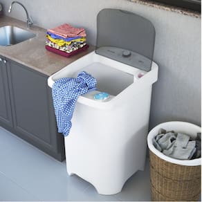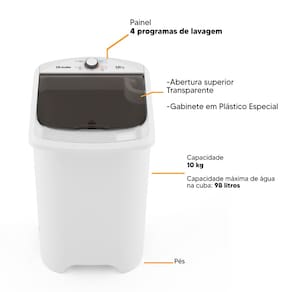 Tanquinho de lavar roupa com capacidade de 10kg, sistema de turbilhonamento, 4 programas de lavagem, esfregador integrado, filtro para fiapos, dispenser para sabão e amaciante, peneira para pequenos objetos e tampa transparente. Gabinete em plástico especial e base dos pés desmontável.Acesso ao cesto