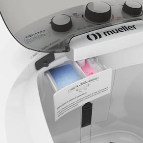 Dispenser para sabão em pó e amaciante O Tanquinho 12kg Family com Aquatec da Mueller também conta com dispenser para sabão em pó e amaciante que permite que os produtos sejam despejados no momento certo da lavagem.