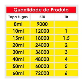 Tapa Fugas F5 Super 8ml Com Mangueira Tapa Fugas F5 Super 8ml com mangueira Tapa Fugas F5 Super 8ml com mangueira Tapa Fugas F5 c/ Mangueira 8ML (Geladeira/Freezer/Ar Condicionado.) O TAPA FUGAS F5, dose única de 8 ml, é um produto para a resolução de vazamentos de gás refrigerante em sistemas de refrigeração, ar condicionado, e também ar condicionado automotivo. O produto pode ser para ar condicionado de até 9000 btu. Para refrigeradores e freezer pode ser o 8ml. *O produto Funciona para furos máximos de 0,5 milímetros, aqueles vazamentos em que o gás demora 30 dias ou mais para vazar do sistema. O sistema deve ser capaz de manter um vácuo no lado de baixa em pelo menos 15 minutos, para que o produto faça efeito. *Importante: Caso o sistema não atenda às especificações acima, significa que o furo é maior que 0,5 mm e não recomendamos o uso do produto. Benefícios com todos os gases de refrigeração como CFC, HFC e HCFC. Tapa permanentemente as fugas. Visível com qualquer lâmpada UV. Redução significativa de ruído e vibração do compressor. Não contém Polímeros. Não reage com a umidade e o ar. Produto ideal para aplicações preventivas. Não danifica o compressor de A/C e as estações de recuperação. Inofensivo para qualquer componente do sistema.