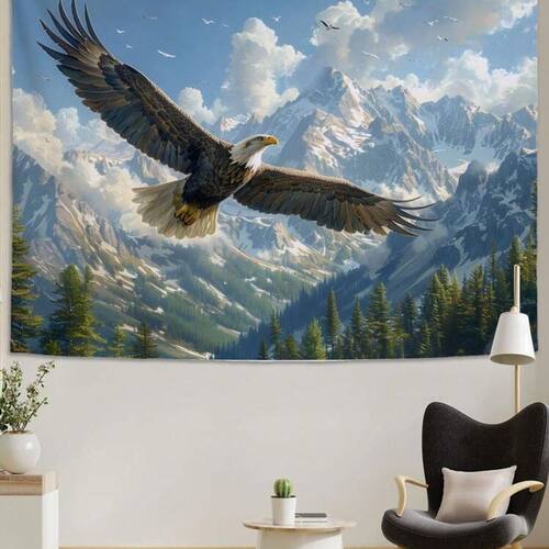 Material: fibra de poliéster (poliéster) Tamanho: 150 cm × 130 cm Peso: 260 g 🦅 Design Majestic Eagle — Apresenta uma poderosa águia careca voando sobre montanhas nevadas e florestas de pinheiros, simbolizando liberdade, força e beleza da natureza. Paisagem montanhosa panorâmica — Detalhes vívidos de céu azul, nuvens e picos acidentados criam uma atmosfera selvagem de tirar o fôlego em seu quarto. 🧵 Tecido de poliéster durável — Feito de poliéster leve, resistente a rugas e ao desbotamento, garantindo cores vibrantes duradouras e estampas nítidas. Decoração artística de parede versátil — ideal para quarto, sala de estar, dormitório, escritório ou espaço de meditação; também pode ser usada como decoração de parede, pano de fundo fotográfico ou capa decorativa. Tamanho grande e fácil de cuidar — mede 150 x 130 cm (59 x 51 polegadas), simples de pendurar com ganchos ou pregos; lavável à máquina, seca rapidamente e fácil de manter.