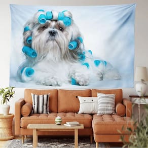 Material: fibra química Tamanho: 150 cm × 130 cm Peso: 200 g Design adorável para cães — Apresenta um cachorro Shih Tzu fofo com rolos azuis no cabelo, criando uma tapeçaria de parede engraçada e charmosa com tema animal. Arte engraçada para animais de estimação — adiciona personalidade e vibrações divertidas ao seu espaço, perfeita para amantes de cães e para quem gosta de uma decoração alegre de arte de parede. 🧵 Tecido de poliéster durável — Feito de poliéster leve, macio, resistente a rugas e estampado com cores vibrantes e resistentes ao desbotamento. Decoração artística de parede versátil — ideal para quarto, sala de estar, dormitório ou quarto infantil; também pode servir como tapeçaria, pano de fundo ou capa decorativa. Tamanho grande e fácil de cuidar — mede 150 x 130 cm (59 x 51 polegadas), simples de pendurar com ganchos ou pregos; lavável à máquina, seca rapidamente e fácil de manter.