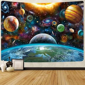 Material: fibra de poliéster (poliéster) Tamanho: 150 cm × 130 cm Peso: 260 g Design vívido de galáxias — apresenta planetas, estrelas e um cenário cósmico colorido, criando uma vista deslumbrante do sistema solar que transforma qualquer parede em uma decoração inspirada no espaço. Tecido de poliéster premium — feito de poliéster leve e durável, macio ao toque, resistente a rugas e fácil de pendurar ou dobrar para armazenamento. Decoração artística de parede versátil — ideal como tapeçaria, tapeçaria de parede, colcha de cama, sofá ou pano de fundo decorativo para quarto, dormitório, sala de estar ou estúdio. Fácil de cuidar e pendurar — Bordas reforçadas para pendurar com segurança, laváveis à máquina em água fria, resistentes ao desbotamento e de secagem rápida, garantindo cores vivas e duradouras. Tamanho de decoração perfeito — mede 150 x 130 cm (59 x 51 polegadas), adequado para espaços de parede médios, adicionando uma atmosfera colorida e artística à sua casa.