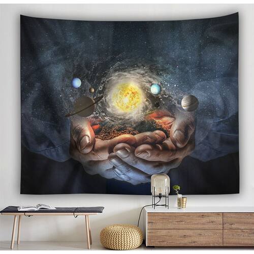 Material: fibra de poliéster (poliéster) Tamanho: 150 cm × 130 cm Peso: 260 g Design do universo cósmico — apresenta um sistema solar impressionante com planetas, sol e elementos galácticos nas mãos, criando uma peça central visual mística e futurista para sua parede. Tecido de poliéster premium — Feita de poliéster leve e durável, esta decoração de parede é macia, fácil de pendurar, resistente a rugas e mantém cores vibrantes para uso duradouro. Decoração de quarto perfeita — Ideal para quartos, salas de estar, dormitórios ou espaços de meditação, adicionando uma sensação de admiração e inspiração cósmica a qualquer estilo de interior. Fácil de instalar e manter — Inclui opções simples de pendurar; o tecido leve facilita a montagem nas paredes e é lavável à máquina para facilitar o cuidado. Tamanho padrão 150x130cm — Grande o suficiente para criar um ponto focal em sua parede, mas versátil para espaços pequenos e grandes, adequado para adultos, adolescentes e amantes da astronomia.