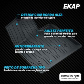 Especificações: - Marca: Ekap - Indicado para o veículo: Song Plus; - Versões aplicáveis: Todas as versões; - Material: borracha TPO flexível e resistente; - Formato: bandeja com bordas altas; - Resistência: à água, poeira, lama e produtos químicos leves; - Instalação: acoplamento no assoalho sem necessidade de ferramentas;