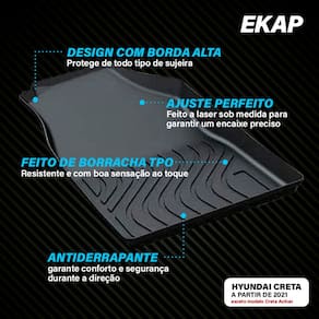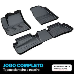 Especificações: - Indicado para o veículo: Creta; - Versões aplicáveis: 2017 a 2025; - Material: borracha TPO flexível e resistente; - Formato: bandeja com bordas altas; - Resistência: à água, poeira, lama e produtos químicos leves; - Instalação: acoplamento no assoalho sem necessidade de ferramentas;