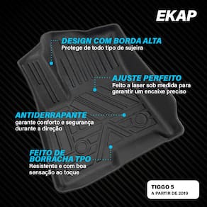 Especificações: Marca: Ekap - Indicado para o veículo: Tiggo; - Versões aplicáveis: 2018 a 2025; - Material: borracha TPO flexível e resistente; - Formato: bandeja com bordas altas; - Resistência: à água, poeira, lama e produtos químicos leves; - Instalação: acoplamento no assoalho sem necessidade de ferramentas;