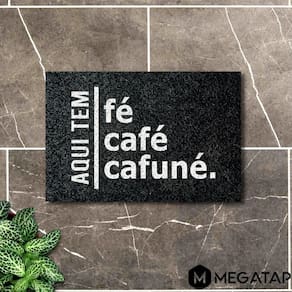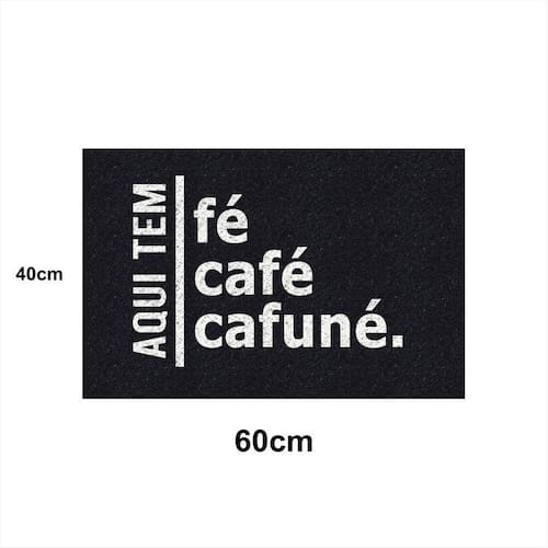 Tapete capacho fe cafe cafune 60x40 decor casa entrada apto Tapete aqui tem fé café e cafuné 60x40 cor:preto A megatap é uma empresa jovem e moderna, e nossa missão é a satisfação de compra dos nossos Clientes. Do primeiro contato até o pós venda, nos preocupamos com a clareza e o um bom Atendimento, prezando por uma boa experiência de compra online Nossos tapetes de alta durabilidade são feitos de produção própria, Somos uma empresa especializada em e-commerce, possuímos loja física e online. Além de deixar seu ambiente muito mais customizado e decorado, nossos tapetes de pvc com 12mm de altura protegerão seu ambiente de toda sujeira sólida, bactérias e vírus. A retenção de sujeira poderá chegar até 80%. Muito prático e fácil de lavar, os tapetes podem ser customizados de acordo com seu tema preferido, Temos linhas residenciais, geek, beers, pet, series, filmes, zen, bem vindo, com sua logo para sua empresa. Tapete capacho Material: vinil 100% pvc Medidas Comprimento: 60cm Largura: 40cm Espessura: 12mm Personalização Pintura: tinta vinílica brilho Aplicação: Ferramenta de aplicação de ar manual Durabilidade: não desbota e não perde a cor Costado: antiderrapante Qualquer dúvida estamos à disposição Aguardamos seu pedido Obrigado pela preferência