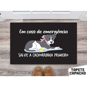 Tapete Capacho Personalizado Divertido Salve A Cachorra Primeiro O tapete decorativo, também conhecido como tapete capacho, é utilizado na porta de entrada para limpar a sujeira trazida pelas solas dos sapatos antes de entrar no ambiente além de ser um detalhe charmoso na decoraçãoIdeal para:- Uso residencial e comercial;- Entradas e outros ambientes comuns;- Uso interno ou externo protegido por área coberta Medidas: 60cm x 40cmComposição: 50% Látex e 50% Fibra Pet Ecologica carpete Principais características:- Antiderrapante;- Lavável;- Emborrachado;- Bordas com Acabamento.cuidados e conservação:Indica-se que a limpeza seja feita regularmente a fim de conservar o produto e aumentar sua durabilidade, pode ser aspirado e lavado.coleções Criativas para você ou para presentear com Estilo. + de 250 Estampas. Confira nossas coleções:- Dog / Gatos / 7 Mares / Viagens / Animais / Frutas / Carros e Motos / Floral / Casual / Infantil / LGBT / Futebol / Geek Games / Signos / Religioso / Profissões / Datas Comemorativas / Frases / Memes.