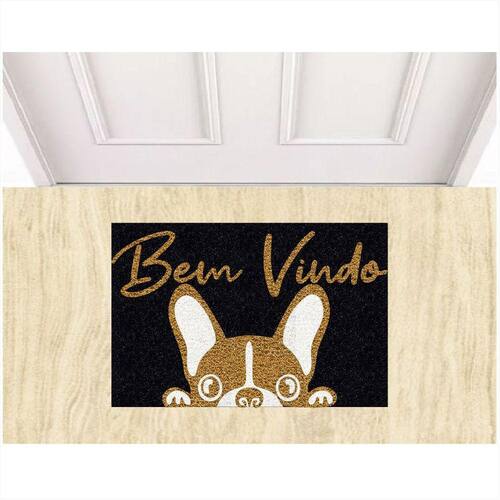 Tapete Capacho Vinil Bem vindo Bulldog Pets Para Decoração. - Cor: Preto