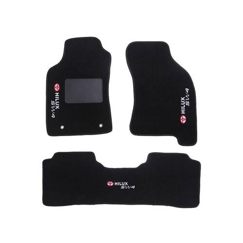 Tapete carpete Hilux SW4 base pinado Jogo de tapete linha elithe carpete com espessura de 5mm na cor preta com base antiderrapante em pvc pinado. Bordado com a grafia e nome, lavável. Jogo com 5 peças. O jogo de tapete linha elithe carpete produzido pela Tapecars, possui um design exclusivo e com acabamento perfeito no seu carro, vem com acabamento nas laterais na cor preta, e com grafia bordada em 3D nos 02 tapetes dianteiros e com tiras aderentes costurado nas duas peças dianteiras para sua maior segurança e melhor fixação do produto. Esse jogo é um produto com excelente qualidade, com 05 peças e o tapete do motorista vem com um pisante em pvc para segurança do motorista, evitando que escorregue. Cor disponível - Preto Especificação técnica do produto - Jogo composto com 5 peças - Carpete de ótima qualidade com 5mm - Base em pvc pinado antiderrapante - Fabricado em polipropileno - Grafia bordada igual ao da montadora - Pisante em pvc no tapete do motorista - tiras aderentes costurado nas 2 peças dianteiras - Bordado lateral nas 2 peças dianteiras - Tapete lavável e impermeável - Proteção anti-chamas - Encaixe perfeito e sob medida Conteúdo da embalagem - 02 Tapetes dianteiros - 02 Tapetes traseiros -01 tapete central - 03 Meses Importante - Valor do jogo - Não nos responsabilizamos por mau uso do produto - Imagens meramente ilustrativas Marca: Não Informado