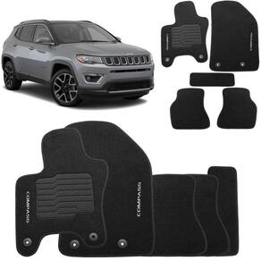 Tapete carpete jeep compass forração detalhes do produto jogo de tapete carpete somente forração preto com grafia logo bordado impermeável 4 peças o jogo de tapete carpete produzido pela scar acessorios possui um design perfeito para o interior do veiculo, ele possui coloração preta, grafia bordada com a logo do veículo e acabamento lateral bordado em