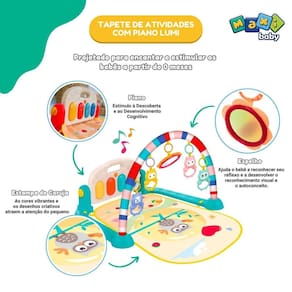 Tapete de Atividades Para Bebê Piano Lumi Laranja - Maxi Baby Transforme o momento de brincar do seu pequeno com o Tapete de Atividades Baby da dm Toys. Este tapete musical é projetado para encantar e estimular os bebês a partir de 0 meses, oferecendo uma experiência única de aprendizado e diversão. Com luzes coloridas, sons envolventes e um tecladinho musical, ele estimula os sentidos e a coordenação motora do seu bebê, promovendo a exploração e a independência. Os brinquedos tipo móbile proporcionam uma interação divertida, enquanto as atividades variadas ajudam no desenvolvimento cognitivo e motor. A montagem é rápida e prática, ideal para pais que buscam conveniência. Com dimensões de 58 cm x 75 cm x 40 cm, este tapete é o espaço perfeito para o seu bebê se divertir enquanto aprende. Certificado pelo Inmetro, o Tapete de Atividades é seguro e durável, proporcionando tranquilidade para os pais. Não perca a oportunidade de oferecer ao seu filho um ambiente lúdico que favorece o desenvolvimento Adquira já o seu Tapete de Atividades e veja seu bebê se encantar com cada descoberta Principais características: - Idade Recomendada: A Partir de 0 Meses - Fácil de montar - Utiliza 2 pilhas AA Não Inclusas - Estimula o Desenvolvimento: Atividades que promovem a coordenação motora e a independência do bebê. - Interatividade: Luzes e sons que capturam a atenção do seu pequeno, incentivando a exploração. - Brinquedos Móbile: Diversão garantida com brinquedos suspensos que se movem e divertem. - Teclado Musical: Proporciona momentos de música e diversão enquanto o bebê brinca. - Fácil Montagem: Prático e rápido de montar, ideal para o dia a dia. Especificações Técnicas: - Conteúdo da Embalagem: 01 Tapete, 02 Bases de Suporte, 01 Teclado Musical, 02 Colunas de Suporte, 01 Arco, 05 Brinquedinhos Tipo Móbile e 05 Anéis - Composição/Material: Plástico - Dimensões do Produto Aberto: 58 cm x 75 cm x 40 cm - Peso Líquido: 700g - Certificação INMETRO 001422/2022 - : 30 Dias Contra Defeito de Fabricação Pelo Fabricante - Referência do Fabricante: 21716 - EAN: 7899403217169 - Marca: Maxi Baby Imagens meramente ilustrativas, as cores e estampas podem variar de acordo com o lote do fabricante.