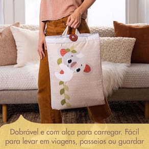 Tapete tamanho XL, super acolchoado e espaçoso. Parte da coleção Boho Chic, cores terrosas inspiradas na natureza, atua no desenvolvimento e ainda complementa sua decoração. Com alça para carregar. Promovendo os sentidos, o desenvolvimento cognitivo e as habilidades motoras, o Super Mat Boho Chic cria um ambiente tranquilo para os bebês brincarem, crescerem, se relacionarem e se comunicarem. Ele conta com um chocalho de madeira destacável, folhas crocantes de esconde-esconde, espelho para prolongar o Tummy Time, fitas coloridas de cetim, além dos adoráveis personagens: a Koala e o Panda, amigáveis e sorridentes. O design em cores terrosas e tecidos macios deste confortável tapete, super acolchoado, inspiram a exploração e ainda complementam a decoração da sua casa.Dobrável e com alça para carregar com você e seu bebê para todos os lugares. Lavável na máquina.Explore as várias habilidades de cada estágio da emocionante jornada do desenvolvimento do seu bebê com essas dicas de idade:0+ meses: CONEXÃO E COMUNICAÇÃODesde os primeiros dias, o Super Mat Boho Chic é o cenário perfeito para se aproximar do seu bebê, criar laços e se conectar. Deite-se ao lado do seu pequeno, aconchegue-se, olhem um para o outro, converse e cante, aproveitando para se conhecerem aos poucos.Meses 1-12: DESENVOLVIMENTO E MEMÓRIAS DIVERTIDASRegistre o desenvolvimento do seu :lho com a ajuda de nossos cartões para marco do desenvolvimento, que oferecem dicas informativas de desenvolvimento e uma ótima decoração para a foto mensal do seu bebê em crescimento.2+ meses: HABILIDADES MOTORAS BRUTAS TUMMY TIMEIncentive seu bebê a :car um pouco mais de bruços com uma das diversas atividades do tapete. Chame a atenção do bebê para o som produzido pelo chocalho de madeira, para as folhas crocantes de esconde-esconde ou ajude-o a se concentrar nas divertidas fitas de cetim ou no espelho de :ltro dos sonhos.5+ meses: COGNIÇÃOQuando seu bebê for mais velho e ficar sentado com con:ança, deixe-o aproveitar este ambiente de brincar relaxante e explorar os vários recursos e atividades do tapete de um novoponto de vista. Os bebês vão aos poucos apreendendo a ideia de permanência do objeto enquanto brincam com as folhas de esconde-esconde, redescobrindo a surpresa escondida por baixo.Todos os nossos produtos são concebidos para apoiar o crescimento e desenvolvimento dos bebês em cada uma de suas fases.