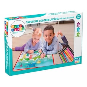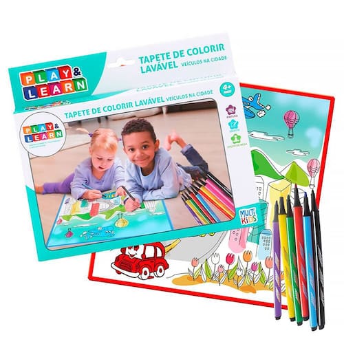 A brincadeira de pintar e colorir é muito mais divertida e colorida! São 6 cores de canetas para escolher, identificar os veículos da cidade e pintar do jeito que quiser. O tapete é lavável e permite brincar quantas vezes quiser! Tapete com tecido macio e seguro, produzido em materiais não-tóxicos e desenvolvidos para crianças, e as canetinhas possuem tinta lavável. O Tapete possui dimensões de 50X50cm.