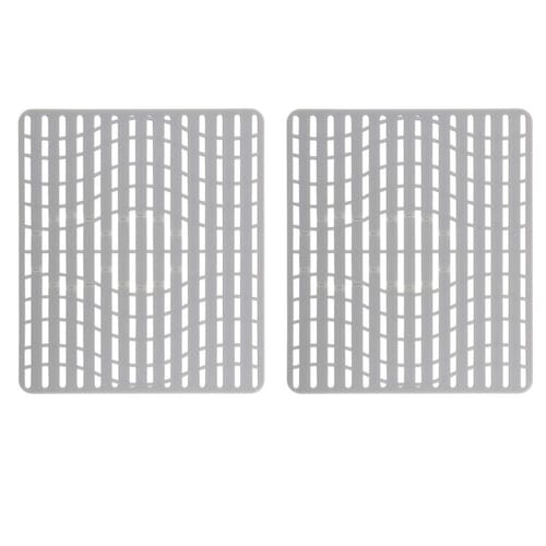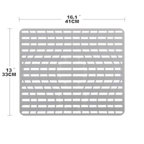Os tapetes de silicone para pia são uma solução inovadora para pia. O silicone macio oferece uma almofada para proteger pia, copos e pratos de arranhões e lascas. Os tapetes de silicone para pia têm pés que os elevam e permitem o fluxo de água e a aeração. Se você quiser ter uma abertura ao redor do ralo, o tapete de pia de silicone tem um padrão conveniente que permite que você faça um furo exatamente onde você precisa, seja o ralo no centro ou na parte de trás da pia. O silicone é seguro para o calor, tornando seguro colocar panelas e frigideiras na pia diretamente do fogão. Estes tapetes de silicone podem ser lavados na lava-louças e não contêm PVC, BPA e ftalatos. - Protetores de pia macios sem PVC para pia de cozinha: Proteja vidraria frágil contra quebra, fornecendo uma almofada contra a superfície dura da pia. Evite arranhões e marcas de panelas, frigideiras e talheres. - Tapete elevado para os pés para permitir o fluxo de água e aeração - O padrão permite cortar um orifício para acomodar a maioria das aberturas de drenagem - O tapete de pia tem o tamanho perfeito para a maioria das pias duplas. Dimensões 40,6 cm x 32,8 cm - Silicone seguro para colocar panelas e frigideiras na pia diretamente do fogão. Pode ser lavado na lava-louças