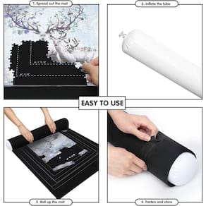 Cor: preto Tamanho: 46 × 26in Sustenta Até: 1.500 pcs Pacote Inclui: tapete de feltro × 1, tubo inflável × 1, banda elástica × 2 Como inflar o tubo: Aperte para abrir a fenda no interior da válvula e soprar ar para inflar o tubo. Nota: O pacote não contém quebra-cabeças, por favor, compre separadamente. O tapete de quebra-cabeça Lavievert é produzido por tecido de feltro ecológico, capaz de segurar até 1.500 quebra-cabeças. Ele oferece excelente proteção aos seus quebra-cabeças e os mantém quietos até a próxima vez que você continuar com o seu jogo. Como é universalmente conhecido, quanto mais difícil é um enigma, mais tempo e paciência precisarão decifrá-lo. Portanto, esperamos ajudá-lo a simplificar o jogo e garantir que você se divirta mais com este produto!