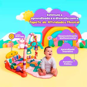 Tapete e Ginásio de Atividades com Piano Musical - Rosa - Zoop Toys: estimule o desenvolvimento da bebê desde os primeiros dias com atividades muito divertidas! Com design confortável e seguro, o Tapete Piano oferece uma variedade de recursos para envolver os sentidos. Possui brinquedos removíveis, acessórios laterais interativos, teclas de piano que reproduzem músicas e luzes, além de ajuste de volume e posição. Detalhes: • Possui pendentes suspensos e removíveis que estimulam os sentidos das crianças • Os acessórios nas laterais rotacionam e fazem barulho • O botão alterna entre os diferentes modos do pianinhos • Quando pressionadas, as teclas do piano tocam música e emitem luzes • O tapete é almofadado e lavável • O botão na traseira do piano ajusta o volume do som • A alavanca regula a posição do pianinho • Lavável e repleto de estímulos sensoriais Informações: • Produto: Tapete Piano para Bebê • Marca: Zoop Toys • Cor: Rosa • Tipo: Tapete de Atividades com Piano • Categoria: Brinquedos para Bebês • Subcategoria: Tapetes e Ginásios de Atividades • Dimensões (C x A x L): 74 x 40 x 60 cm • Conteúdo: - 01 Tapete - 01 Piano - 01 Arco - 01 Espelho - 02 Apoios - 04 Chocalhos • Recomendação: para bebês a partir de 00 até 24 meses de idade Especificações: • Referência: ZP01026 • Código de Barras: 7899788406493 • Embalagem (C x A x L): 49 x 37 x 08 cm • Embalagem (Peso): 0.901 Kg • Material / Composição: - Estrutura e brinquedos: Plástico - Tecido 100% Poliéster • Funcionamento: 02 Pilhas “AA” • Registro: 006147/2019 • Certificado: Órgãos Autorizados - OCP´S (Organismos de Certificação de Produtos) Aviso: • As imagens são meramente ilustrativas • Os pesos, tamanhos e medidas são aproximados • As cores e estampas dos produtos podem ter variações • As informações são de responsabilidade do fabricante ou fornecedor