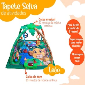 O tapete selva da color baby é o tapete de atividades perfeito para o seu bebê, indicado para bebês a partir de 2 meses, ele estimula a capacidade motora da criança, desenvolve sua visão, audição e tato. O tapete selva é grande e possui muitos brinquedos super diferenciados para as crianças soltar a imaginação, os brinquedos diversos com cores e texturas diferentes incluindo mordedor, animais de pelúcia, chocalho e duas caixinhas musicais. A caixinha musical do teto do tapete pode tocar 20 minutos de música sem parar, esse tapete é super lindo cheio de detalhe com acabamento diferenciado, reforçado e super interativo, perfeito para o seu bebê!