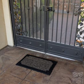 - O tapete de porta de juta de dois tons da Filigrree Welcome tem lâminas de limpeza que removem a sujeira e os detritos do lado de fora