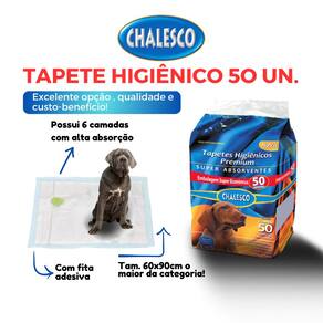 Tapete Higiênico Para Cães Chalesco C/50 Unidades - Indicado para cães; - Com gel super absorvente; - Controle de odor; - Atrativo Canino; - Barreiras anti-vazamento; - Tamanho 90x60cm. A Importância do tapete higiênico para cachorro Há um bom tempo, ter um cachorro em casa significava bagunça no ambiente, já que era necessário recorrer à utilização de jornais para definir os espaços que os cãezinhos poderiam realizar suas necessidades.