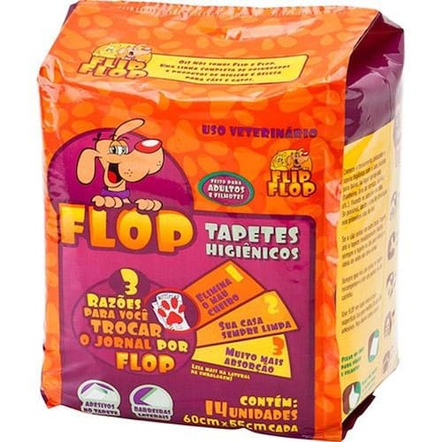 Tapete higiênico para adultos e filhotes. Ótimo para treinar seu cão, de qualquer raça. Para casas e apartamentos. FLOP não precisa ser trocado várias vezes ao dia para evitar o mau cheiro da urina como acontece com o jornal. Além disso, FLOP possui gel superabsorvente com inibidor de odores e uma camada de plástico que dá maior segurança contra vazamentos. FLOP é super absorvente, é prático, é higiênico e sua casa estará sempre limpa. Absorve 700 ml de líquido, porque é composto de materiais absorventes. Também possui adesivos que facilitam a fixação no chão e na parede.