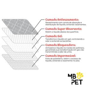 O Tapete Higiênico Premium MB PET é 25% mais absorvente. Graças a sua tecnologia com cinco camadas, o produto não apenas absorve a urina, como é antivazamento e controla o odor. Os tapetes possuem ainda atrativo canino e fitas adesivas para fixação, garantindo praticidade e conforto para o seu pet. Camadas: 1 - Camada Anti-Vazamento, que possui um revestimento com canais de absorção e distribuição de líquidos, evitando vazamentos. 2 - Camada Super Absorvente que retém o líquido abaixo da superfície. 3 - Camada de Gel que transforma tal líquido em gel, controlando o odor e evitando bactérias. 4 - Camada Bloqueadora, que armazena o líquido no núcleo do polímero, garantindo sua transformação em gel, não transmitindo odor e evitando as bactérias. 5 - Camada Impermeável, feita de polietileno que retém o excesso do líquido, evitando o vazamento no piso. Especificações técnicas Marca: MB PET Modelo: Premium Possui adesivo de fixar: Sim Recomendação: Cachorro Atrativo Canino: Sim Descartável: Sim Medida de cada tapete: 80 x 60 cm Dimensões: 20 x 26 x 20 cm Peso: 1,5Kg Itens inclusos: 2 embalagem, contendo 30 tapetes cada Totalizando 60 unidades. Marca: MB PET Ean: 7909463118587