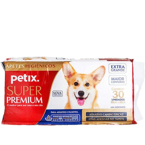 Tapete Higienico Petix Super Premium com 30 Unid- Atrativo Canino;- Vedação Especial;- Fitas Adesivas no Tapete;- Máxima proteção contra vazamentos;- Abas protetoras laterais;- Sistema de Ranhuras anti-poças;- Mais Gel absorvente, Menos Odor;- Com abas protetoras laterais, sistema de ranhuras e gel absorvente anti-odor; - Produto de alta qualidade para você e seu cão, pois por meio do treinamento feito com seu cão, você permite ensiná-lo de maneira correta e ainda deixa os ambientes de sua casa mais limpos e com bom cheiro;