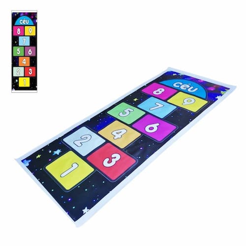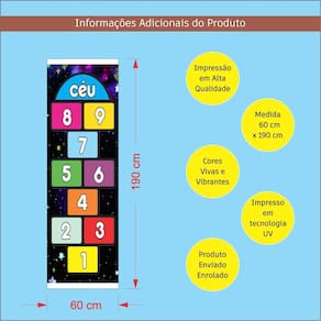 Tapete pedagógico - amarelinha Brincando e aprendendo com a amarelinha A amarelinha é um jogo clássico que desenvolve a coordenação motora, equilíbrio, concentração e raciocínio lógico das crianças. Este tapete pedagógico foi criado para tornar a aprendizagem mais divertida, estimulando habilidades essenciais de forma lúdica e interativa. Como jogar: 1. Jogue uma pedrinha ou marcador na primeira casa. 2. Pule com um pé só nas casas individuais e com os dois pés nas casas duplas. 3. Ao chegar ao final, vire-se e volte pegando a pedrinha. 4. Passe para a próxima casa e continue até completar o percurso. 5. Quem errar passa a vez para o próximo jogador Benefícios do tapete pedagógico: estimula a psicomotricidade e a coordenação corporal. auxilia no aprendizado de números e sequências. incentiva a socialização e o respeito às regras. pode ser em diferentes ambientes sala de aula, recreação, terapias . Dica: varie o jogo adicionando desafios, como pular com os olhos fechados ou contar de trás para frente Vamos pular e aprender juntos Fabricado em lona vinilica com impressão uv Tamanho: 190 x 60 cm Homologação Inmetro: CE-BRI/IQB 002755 54760/21-032 Marca: Não Informado