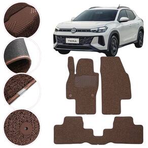 Elegância: Tapete personalizado por modelo de veículo, cobrindo totalmente os espaços dianteiros e traseiros. Tapete em Vinil Gold flexível, com bordas em couro da mesma cor.