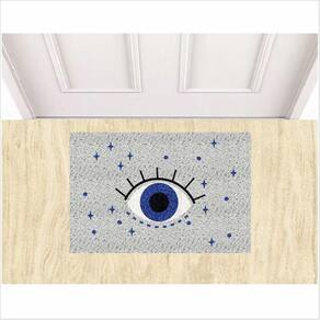 Tapete Capacho Vinil com fibras entrelaçadas e costado emborrachado com arte pinta em tinta vinílica especial.