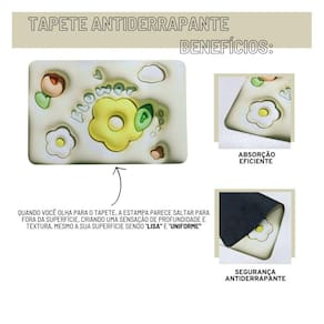 Tapete absorvente, macio e confortável. É antiderrapante e seca mais rápido que outros tapetes, pois possui uma forte absorvição de água. A característica mais notável deste tapete é a sua estampa em 3D, que cria uma ilusão de ótica de alto relevo. Isso é alcançado através de uma combinação de técnicas de impressão de alta resolução e uso inteligente de sombras e cores. Quando você olha para o tapete, a estampa parece saltar para fora da superfície, criando uma sensação de profundidade e textura.