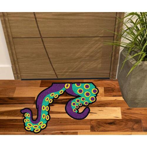 Tapete tipo Capacho Vinil com fibras entrelaçadas e costado emborrachado com arte pinta em tinta vinílica especial.