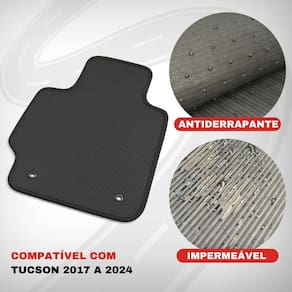 Sobre o Produto - Este jogo de tapetes para Tucson 2017 a 2024 é produzido em borracha PVC automotiva de 4 mm, com base antiderrapante pinada e superfície frisada, ideal para uso diário. - Acompanha descanso de pé na peça do motorista, fixo e resistente não é acolchoado , ideal para proteger a região de maior desgaste.