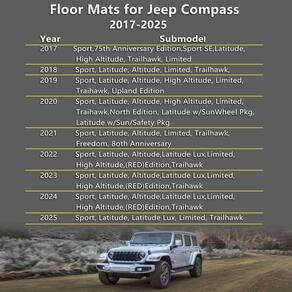 Conjunto de tapetes de chão de ajuste personalizado – Tapetes de chão compatíveis com tapetes Jeep Compass 2017 (novo estilo de carroceria 2ª geração) 2018 2019 2020 2021 2022 2023 2024 2025, acessórios para carros Jeep Compass tapetes automotivos e conjunto de tapete de porta-malas. A digitalização a laser 3D dos dados autênticos do carro garante um ajuste personalizado para Jeep Compass com cobertura máxima total em tapetes automotivos, garantindo uma condução segura por todo o caminho. - Conjunto de tapetes de chão de ajuste personalizado – Tapetes de chão compatíveis com Jeep Compass tapetes 2017 (novo estilo de carroceria 2ª geração) 2018 2019 2020 2021 2022 2023 2024 2025 Latitude Lux Altitude High Altitude Sport Limted Trailhawk. A digitalização a laser 3D dos dados autênticos do carro garante um ajuste personalizado para Jeep Compass com cobertura máxima total em tapetes automotivos. (Não serve para bússola estilo corpo antigo 2017 1ª geração) - Design de parede alta – Para tapetes Jeep Compass, as nervuras profundas e ranhuras são projetadas para canalizar a água e as bordas chanfradas impedem que as paredes se curvem. O design de parede alta pode isolar completamente bagunça e detritos dentro do conjunto de tapetes automotivos e tapetes de porta-malas do seu Jeep Compass 2017-2025 - Fácil de limpar – Os revestimentos de chão e tapete de carga para Compass 2024 são fáceis de limpar, não derramam e não acumulam manchas ou acumulam. A superfície texturizada antiderrapante e os materiais de núcleo de alta densidade retêm líquidos, leite, neve, sujeira, areia etc. Leva apenas alguns minutos para lavar com água ou toalha úmida - Inodoro - Os acessórios KARPAL Compass feitos de TPE (elastômero termoplástico) são recicláveis e inodoros. Tapetes automotivos O forro de carga para Jeep Compass 17-25 pode aguentar em condições climáticas extremas. Você não precisa se preocupar com rachaduras, ondulações ou quebras dos tapetes - Serviço pós-venda - Somos uma fábrica Autêntico há muitos anos, fornecendo principalmente tapetes para vários vendedores no mercado. Estamos sempre prontos para fornecer a você os tapetes de chão mais econômicos e soluções profissionais - Observações: Coloque a bandeja de carga na posição inferior antes de instalar. Você pode consultar a imagem da nossa listagem, se necessário