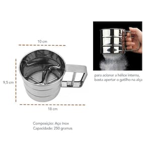 Contem: 1 Caneca Polvilhador Medidas: 18 x 9,5 cm Material: Aço Inoxidavel