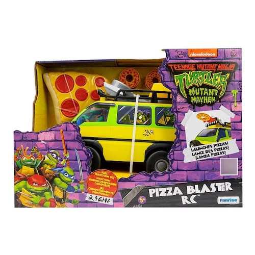 O Veículo Tartarugas Ninja Pizza Blaster RC possui um controle remoto com formato de pizza e 7 funções diferentes, permitindo que você tenha o controle total sobre o furgão. Através do controle, você pode acelerar, frear, virar para a esquerda e para a direita, e até mesmo disparar discos de pizza!