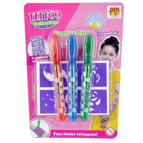 Tatto Collection 3 Canetas Gel E Adesivos - Dm Toys Dê um toque de criatividade ao seu visual com o Tattoo Collection Canetas Gel e Adesivos da DM Toys! Este kit incrível vem com tudo que você precisa para criar tatuagens temporárias deslumbrantes, as possibilidades são infinitas. Deixe sua imaginação voar e crie designs únicos que combinam com seu estilo pessoal. Seja para uma festa, evento especial ou apenas para expressar sua individualidade, o Tattoo Collection é a escolha perfeita para arrasar no seu visual! Código: 102118 Dimensões aprox. da embalagem em cm: 2x15x20 Peso liq. Aproximado do produto na embalagem: 65g Referência do Modelo: DMT6572 Certificado Inmetro: 003965/2023 Conteúdo da Embalagem: 03 Canetas gel de tatuagem, 08 stencils adesivos, adesivos Composição/material: - Canetas: água, glicerina, conservantes, espessantes e corantes. - Stencil adesivo: PVC Idade recomendada: a partir de 3 anos Garantia: 90 dias contra defeitos de fabricação pelo fabricante. Imagens meramente ilustrativas. As cores e tonalidades podem variar. Gênero - Meninas Meninos Unissex Idade - 3 anos 4 anos 5 anos 6 anos 7 anos 8 Anos Coleção - Colecionável Tipo - Carimbos Para Colorir