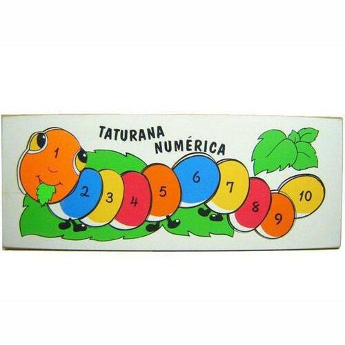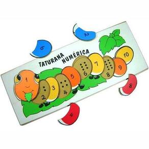 Peças em madeira, estimulam a criança a relacionar, encaixando o número correto com o fundo da placa.