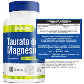 Taurato de magnésio fonte de magnésio 60 cápsulas - duom Taurato de magnésio fonte de magnésio 60 cápsulas - duom - descrição - indústria do corpoO magnésio taurato em cápsulas é um suplemento alimentar a base do aminoácido taurina e magnésio quelato. Composto pelo mineral magnésio em uma das suas formas mais biodisponíveis e o aminoácido taurina que é condicionalmente essencial para o organismo.O que é magnésio tauratoO mineral magnésio exerce muitas funções bioquímicas principalmente relacionadas às funções do sistema nervoso e do sistema cardiovascular. O magnésio e a taurina possuem ação similar em alguns tecidos alvo, por isso, o motivo de combiná-los em um único suplemento.Além de corrigir a deficiência de magnésio, o magnésio associado à taurina pode atuar de forma sinérgica trazendo benefícios complementares à saúde. Geralmente a magnésio taurato é indicado para suprir carências nutricionais e atuar nas funções cardíacas e do sistema nervoso. A importância da taurinaA taurina é um aminoácido condicionalmente essencial que pode ser produzido pelo organismo a partir dos aminoácidos cisteína e metionina e que também precisa da presença de vitamina b6.A taurina é o segundo aminoácido mais abundante no organismo, muito encontrado no fluido intracelular, no reservatório onde fica os aminoácidos livres, no coração, leucócitos, retina, sistema nervoso central e principalmente no músculo.Ela tem atuação na comunicação nervosa, no sistema cardiovascular, regulando certas funções e fluidos cardíacos e tem ação antioxidante. - benefícios - indústria do corpo- tem excelente biodisponibilidade: nesta forma o magnésio é melhor absorvido;- suplemento seguro: possui doses seguras tanto para o magnésio quanto para a taurina;- têm ação sinérgica: possuem ação similar em alguns tecidos alvo aumentando a eficácia de atuação quando associados;- metabolismo energético;- metabolismo de proteínas - carboidratos e gorduras;- funcionamento neuromuscular e muscular;- combate dores no corpo e nas articulações;- auxilia no transporte de cálcio para ossos;- auxilia no combate as câimbras;- excelente na luta contra as dores fibromialgia;- auxilia no combate dores de cabeça e enxaqueca;- auxilia a regular o coração: batimentos cardíacos;- melhorar o desempenho físico, porque é importante para a contração muscular. - sugestão de uso - indústria do corpoTomar 3 cápsulas ao dia, próximo as refeições. - tabela nutricional - indústria do corpo- anexo nas imagens - - composição - indústria do corpo- anexo nas imagens - - recomendações - indústria do corpo- anexo nas imagens - - dados técnicos - indústria do corpoMarca - duom.Conteúdo líquido por frasco - 60 cápsulas.Rendimento total - 20 doses/porções.Peso líquido total - 30g.Peso aproximado produto + embalagem - 100g.Código de barras (ean) - 7898665752227.Registro anvisa - dispensado de registro de acordo com a resolução da rdc 27/2010 e rdc 240/2018 da anvisa.Dimensões do produto - largura: 7,5 cm; altura: 13 cm; comprimento: 7,5 cm.Dimensões da embalagem/pacote - largura: 13 cm; altura: 7 cm; comprimento: 16 cm. - itens do anúncio - indústria do corpo- 1 unidade do produto: taurato de magnésio fonte de magnésio 60 cápsulas - duomTotal - 60 cápsulas.