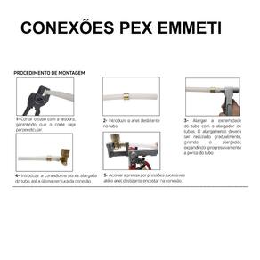 Condições de trabalho: Os tubos e conexões PEX são fabricados conforme ISSO 15875 e NBR 15939 e atende os requisitos das normas NBR 5626 e NBR 7198 Uso: Em tubos Sfera Pex Monocamada Emmeti para água Material: Latão Fabricante: Emmeti Garantia: A garantia do sistema de tubos e conexões PEX é de 10 anos. A utilização dos componentes de outros fabricantes em cojunto com os produtos Sfera-PEX implica na perda da garantia do produto. O sistema SFERA-PEX pode ser embutido na alvenaria - P1368K02