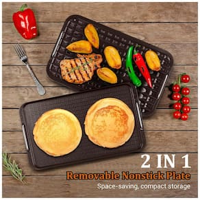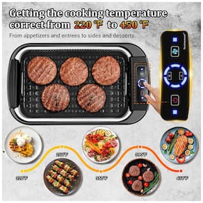 Churrasqueira elétrica portátil com painel de controle, serve 5 porções. Possui tampa de vidro temperado, bandeja de gotejamento, superfície de cozimento antiaderente e controle de temperatura variável. Elemento de aquecimento de 1500W. Sistema de ventilador embutido para redução de fumaça. Placa de grelha removível e bandeja de gotejamento laváveis na máquina de lavar louça.Vendido e entregue por Ecletiq