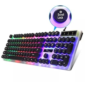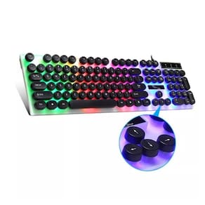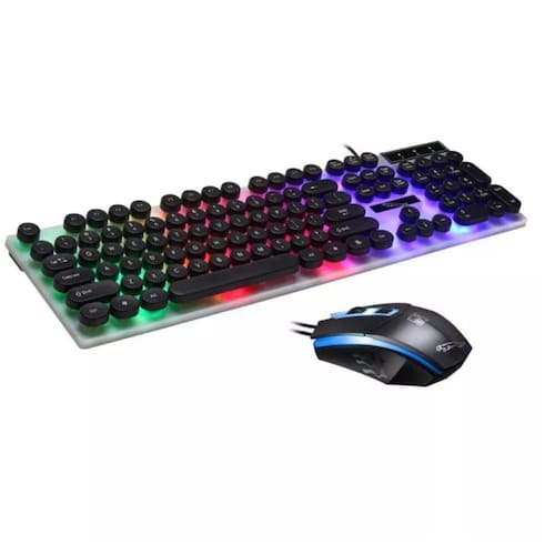 CARACTERÍSTICAS: Este teclado com fio foi projetado com efeito de luz de fundo, o que é ótimo. Os botões flutuantes ergonômicos proporcionam uma excelente sensação de mão. Há um botão para ligar ou desligar o efeito de luz. O tripé ajustável na parte traseira do teclado pode proporcionar uma melhor experiência. É equipado com um mouse com fio, possui luz LED e rodas de rolagem antiderrapantes 3D.\ nMaterial: ABS\ nBotões do teclado: 104 botões\ nBotões do mouse: 3 botões (roda de rolagem incluída)\ nErgonômico, com fio, retroiluminado.