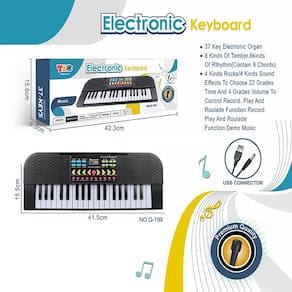 Teclado com microfone para quem está se iniciando na música. Possui 37 teclas, 06 músicas demonstrativas para acompanhar soltando a voz, 8 ritmos e tons.