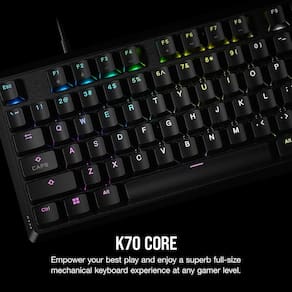 O Teclado Corsair K70 Core combina desempenho, durabilidade e estilo, tornando-se a escolha ideal para gamers e profissionais. Equipado com interruptores mecânicos Cherry MX, oferece uma digitação precisa e responsiva, ideal para sessões de jogo intensas. Sua acústica agradável é garantida por duas camadas de espuma com amortecimento de som. A placa superior de alumínio assegura durabilidade e resistência. A iluminação RGB personalizável adiciona um toque estético.